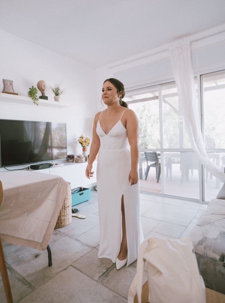 מידה XS (34), מתאימה לבנות יחסית נמוכות, עם שסע ובעלת שובל קטן מאחורה.