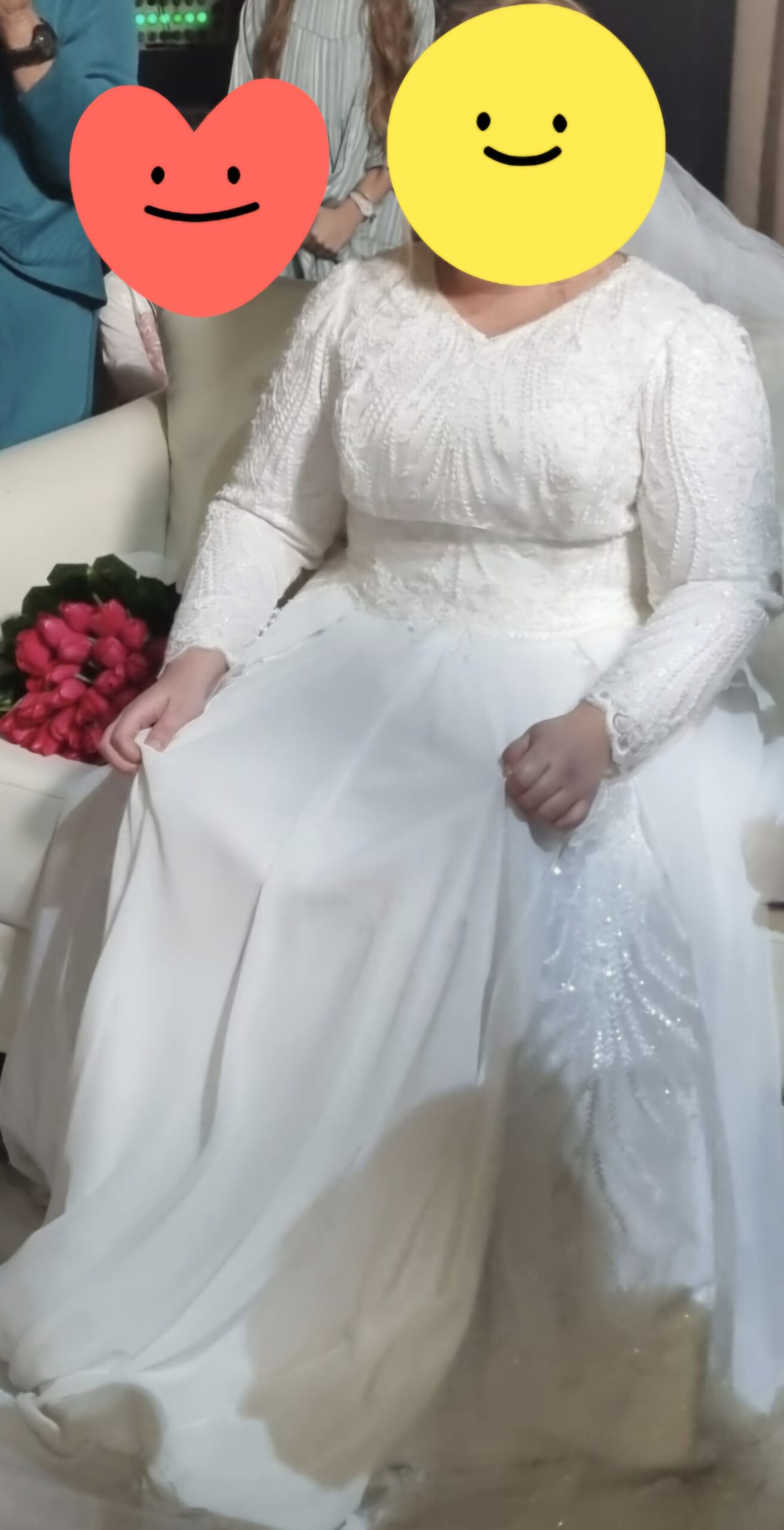 שמלת כלה מטריפה! עבודת יד מוקפדת עד התפר האחרון! מיועדת לכלות במידה גדולה. נתפרה עבור כלה דתייה ומותאמת במיוחד ברוחב, מפתח ואורך שרוולים. נתפרה לכלה שהתחתנה בחורף עם עושר שכבות כדי לתת עומק לבגד. שמלה מאד עשירה ומעניינת. מידות השמלה: היקף חזה- 114 היקף מותן- 102-104 אורך שרוול- 55 אורך קדמי- 46 אורך חצאית- 102 אורך שמלה- 145 מידה- 48-50