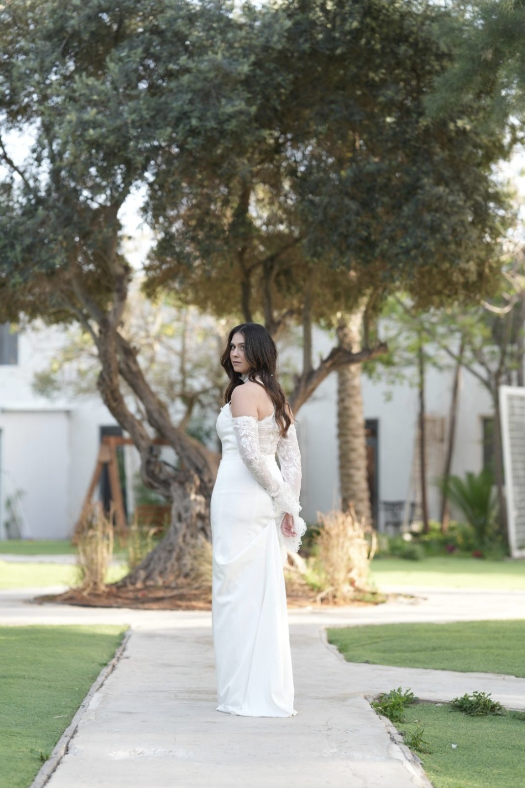 שלום, שמלת כלה מבד משי ותחרה, עם שרוולי תחרה וקולר תחרה צמוד לצוואר – אלגנטיות מובטחת.