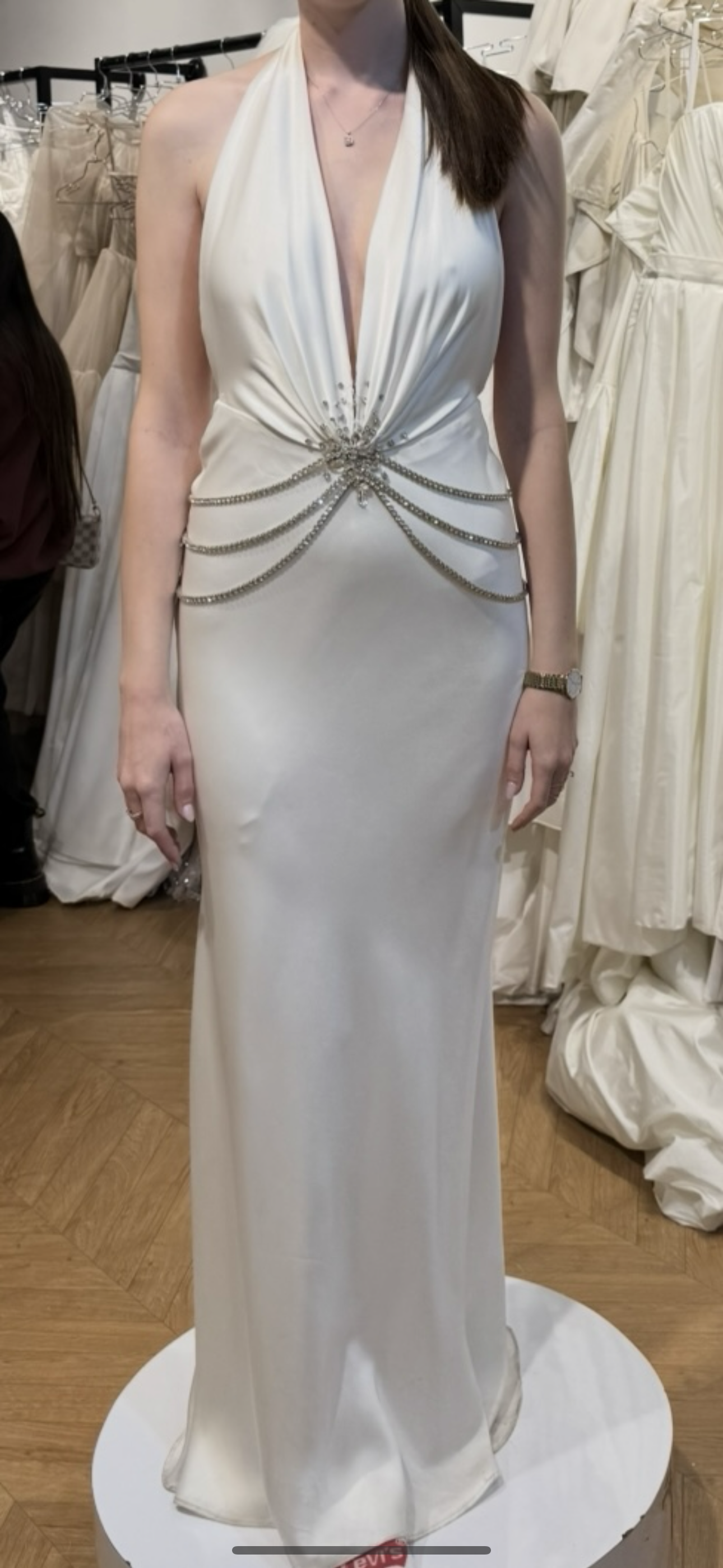 שמלה ארוכה מהממת של דניאלה חג׳ג׳, בד משי סאטן מבריק עם עיטורים במותניים ומחשוף עמוק.