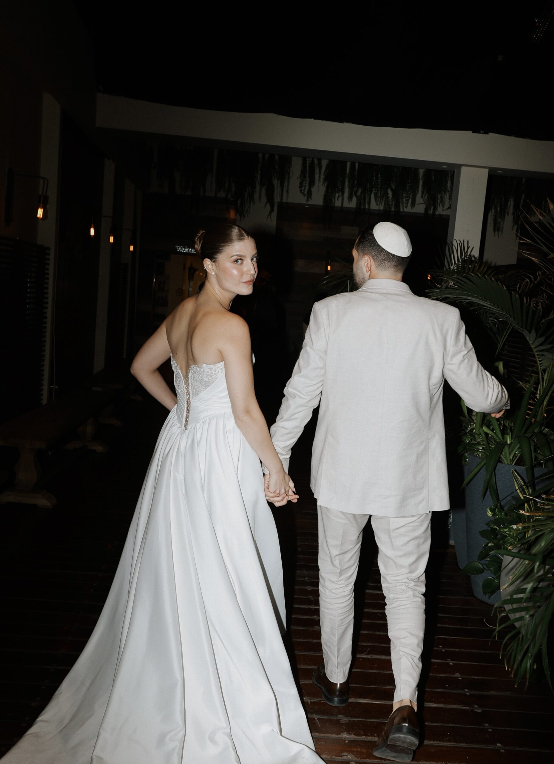 השמלה נתפרה מאפס בהתאמה אישית. על ידי מעצבת בארה״ב לקראת החתונה. לשמלה יש עליונית לחופה שבקלות מורידים לשמלה מעוצבת וקלילה. נעשה מבד סופר איכותי, החלק העליון תחרה שתפורה ידנית עם סגירת כפתורי פנינה מאחורה. נשמרה בקפידה מיום החתונה.